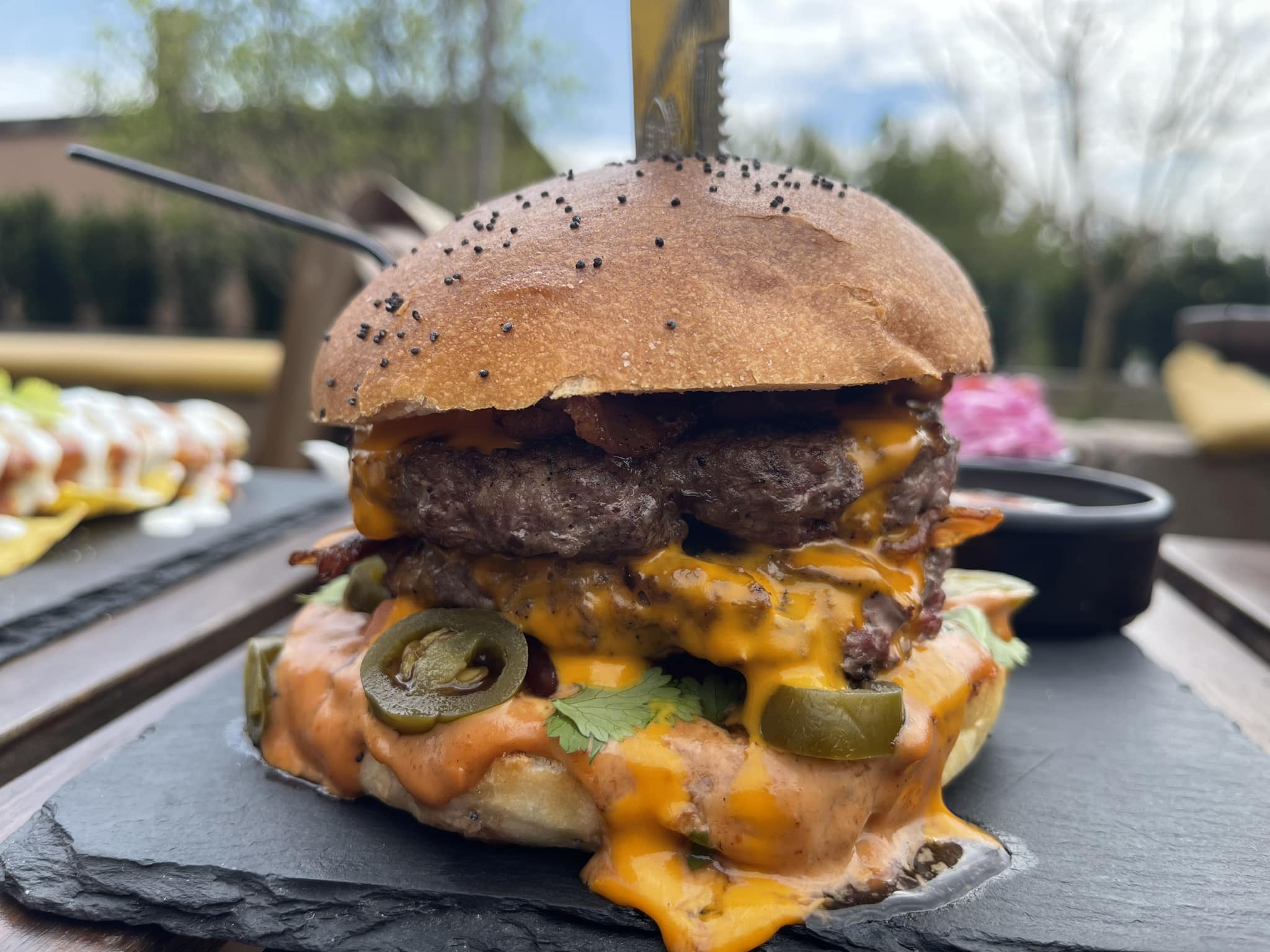 2×15 dkg Angus marhahúspogácsa, chipotle-majonéz, dupla bacon, savanyú uborka, friss lilahagyma, kockázott paradicsom, jalapeno, cheddar sajt, lyoni hagyma
