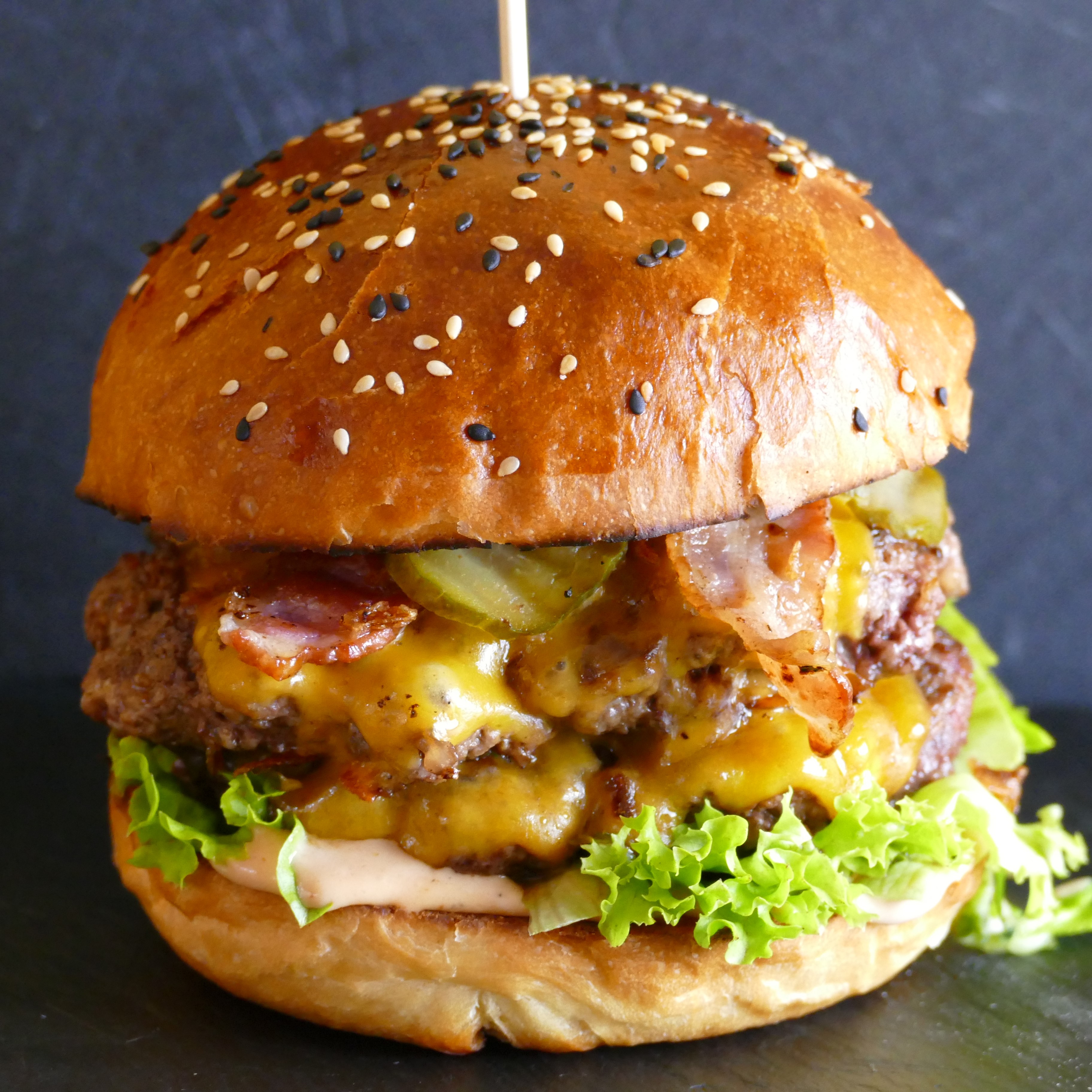 2 x 15 dkg Angus marhahúspogácsa, bacon, dupla cheddar, saláta, pirított hagyma, savanyú uborka, koktélszósz.