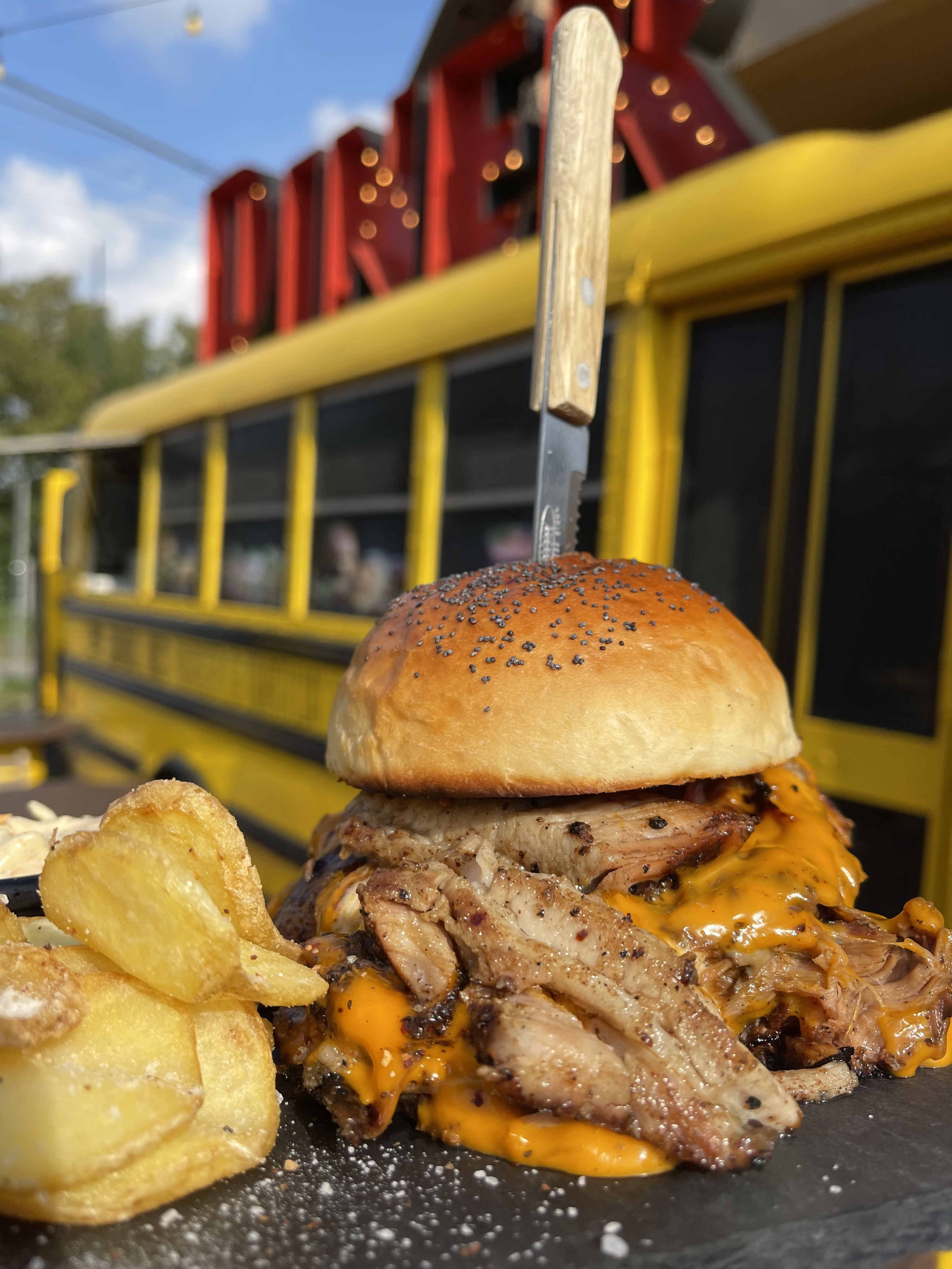 15 dkg Angus marhahúspogácsa, ropogós bacon, savanyú uborka, pirított hagyma, házi BBQ szósz, cheddar sajt