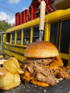 Tépett, füstölt malaccsászár, BBQ szósz, gyömbéres-majonézes káposztasaláta, rántott hagymakarika, olvasztott cheddar sajt